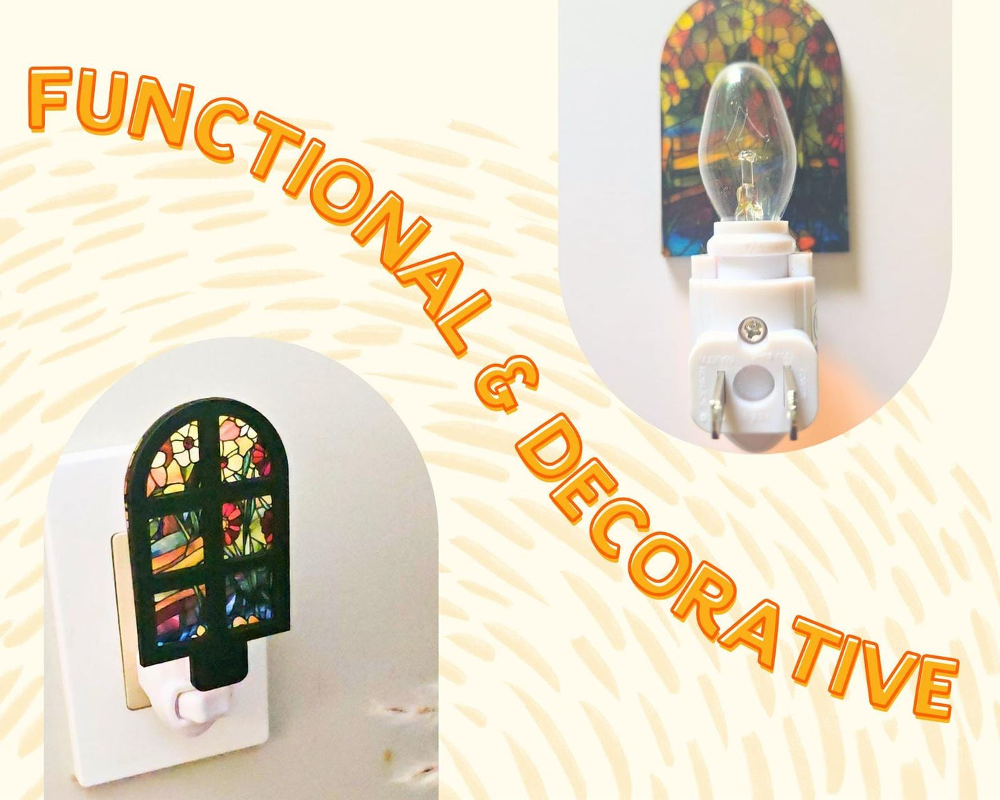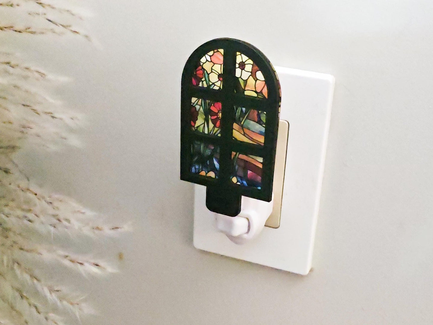 Bring cozy charm and colorful beauty to your space with this wildflower-inspired stained glass night light. Designed to mimic the look of an arched cathedral window, this plug-in light casts a soft, warm glow while adding a vibrant floral touch to your decor.