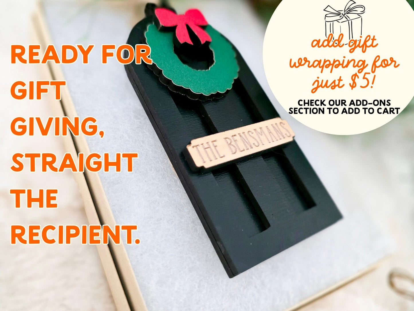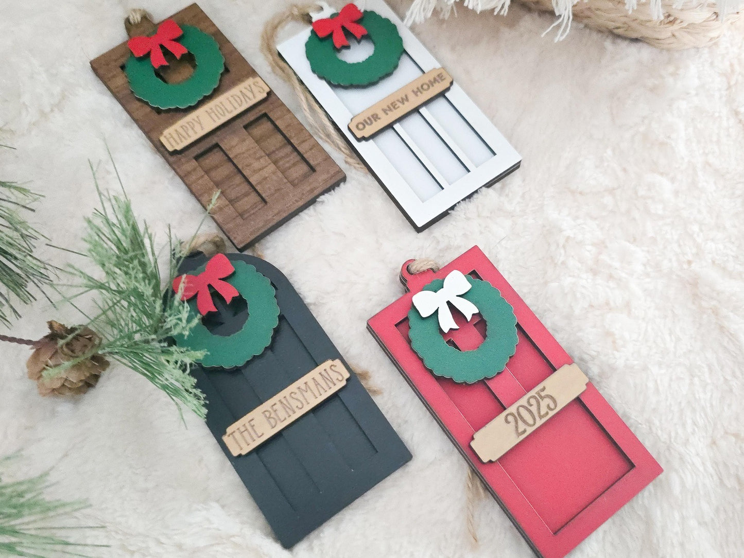 Add a festive and personal touch to your holiday decor with this custom Christmas door ornament! Each mini door features a layered design with a wreath and bow, and can be personalized with your family name, a special year, or message like Happy Holidays or Our New Home.