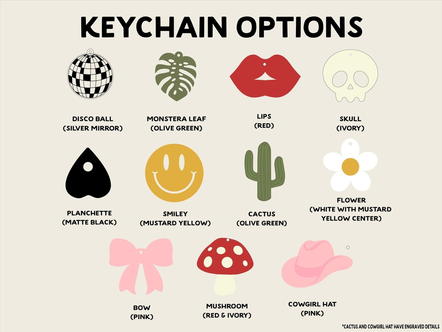 Add a pop of personality wherever you go with these mini acrylic keychains! Each keychain features a fun and unique charm—choose from smiley faces, cowgirl hats, lips, mushrooms, disco balls, cacti, bows, skulls, flowers, and more. Perfect for jazzing up your keys, backpack, purse, or gifting to friends.
