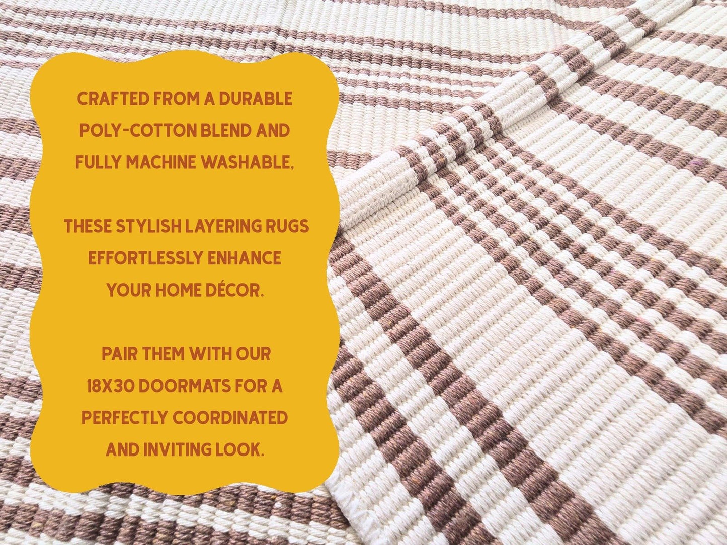 Add warmth and texture to your home with this 24"x36" tan stripe woven layering rug. Made from durable materials, it's perfect for indoor or outdoor use. Ideal for pairing with doormats or as a standalone accent. Stylish, versatile, and easy to maintain.