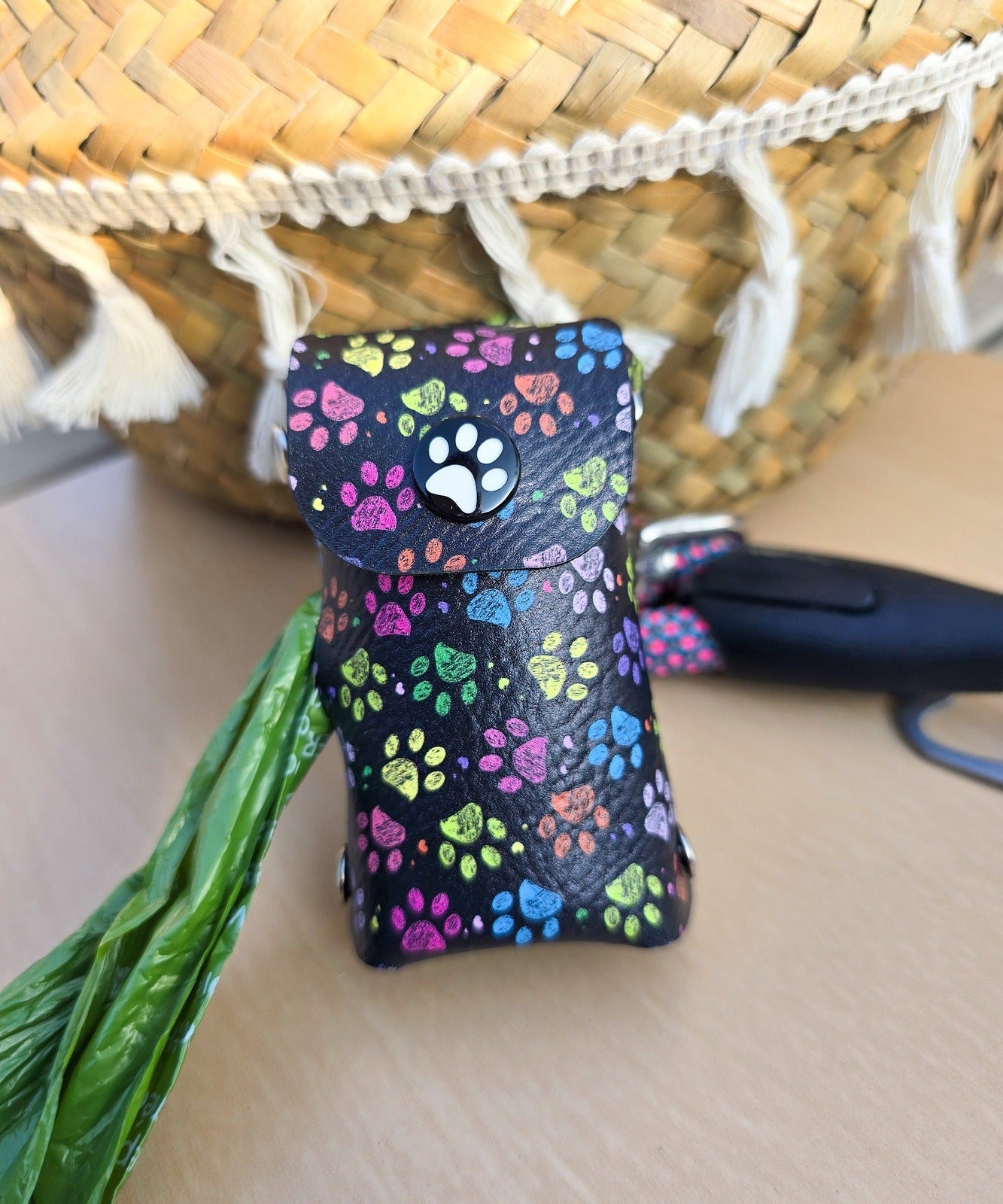 💛 Stylish Design: Features a black base with a multi-colored neon paw print pattern and a cute centerpiece paw button.