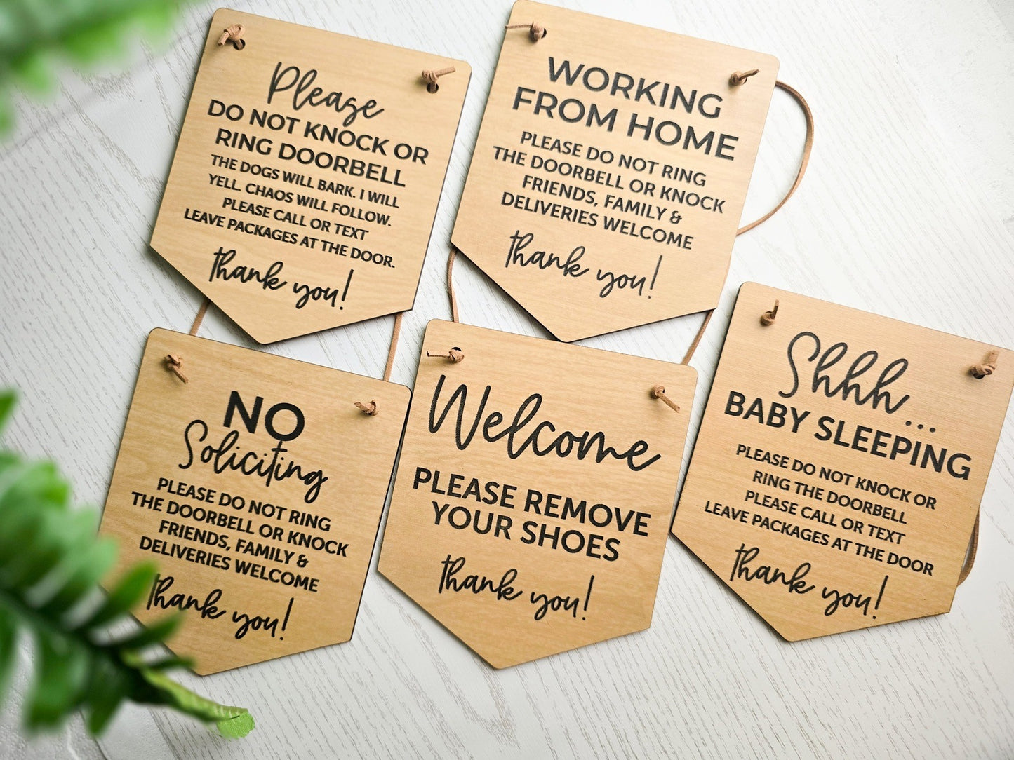 Our No Soliciting front door engraved wooden sign is the perfect way to politely let visitors know to keep the noise down at the front door and keep solicitors away.