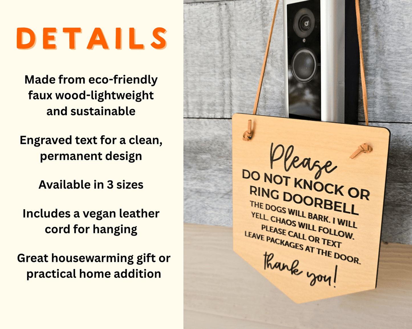 This sign measures approximately 6 inches tall, 5 inches wide, and 1/4 inches thick engraved on unfinished wood. It includes a vegan leather cord for hanging.